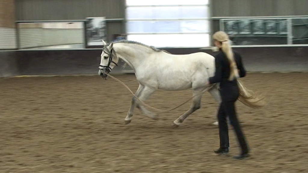Het galopperen aan de longe ging toen hij er net was nog wel eens gepaard met kortsluiting, wat zich uitte in kort, hipperig en hectisch galopperen, maar dat is inmiddels over. Door te negeren wat niet goed gaat en hem vooral te belonen voor elke goede pas, kreeg hij steeds meer vertrouwen en gaat de galop nu altijd goed.